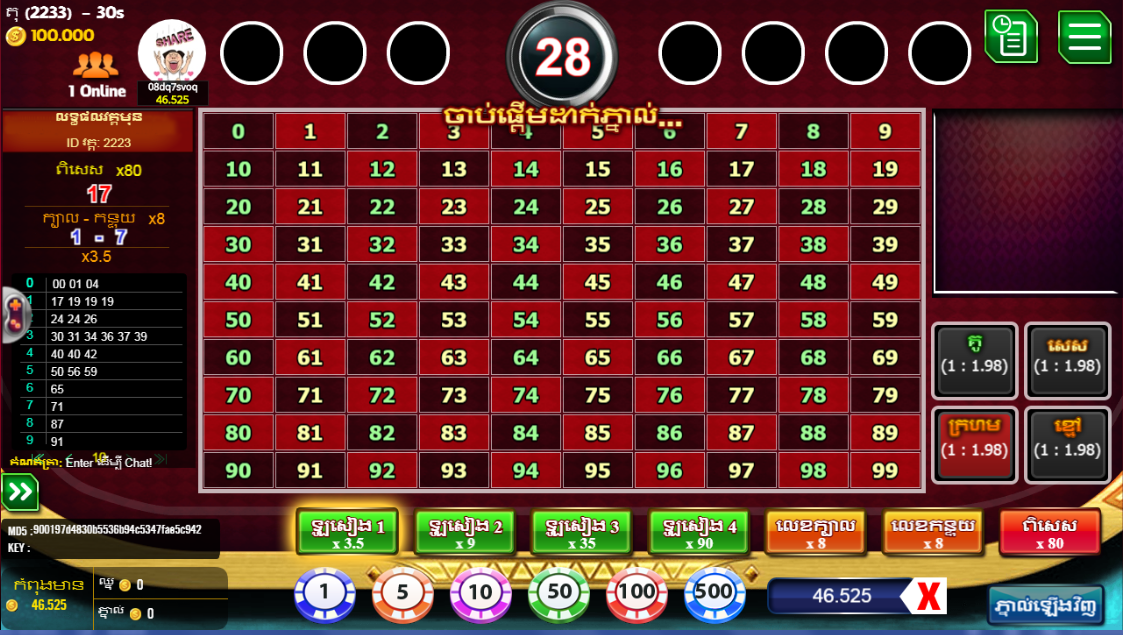 - គត់សេស ក្រហមខ្មៅៈ នៅការភ្នាល់នេះ អ្នកលេងមានសិទ្ធភ្នាល់លេខពិសេសគឺ គត់ឬសេស ពណ៍ក្រហមឬខ្មៅ មានអត្រាភ្នាល់គឺ 1:1.98