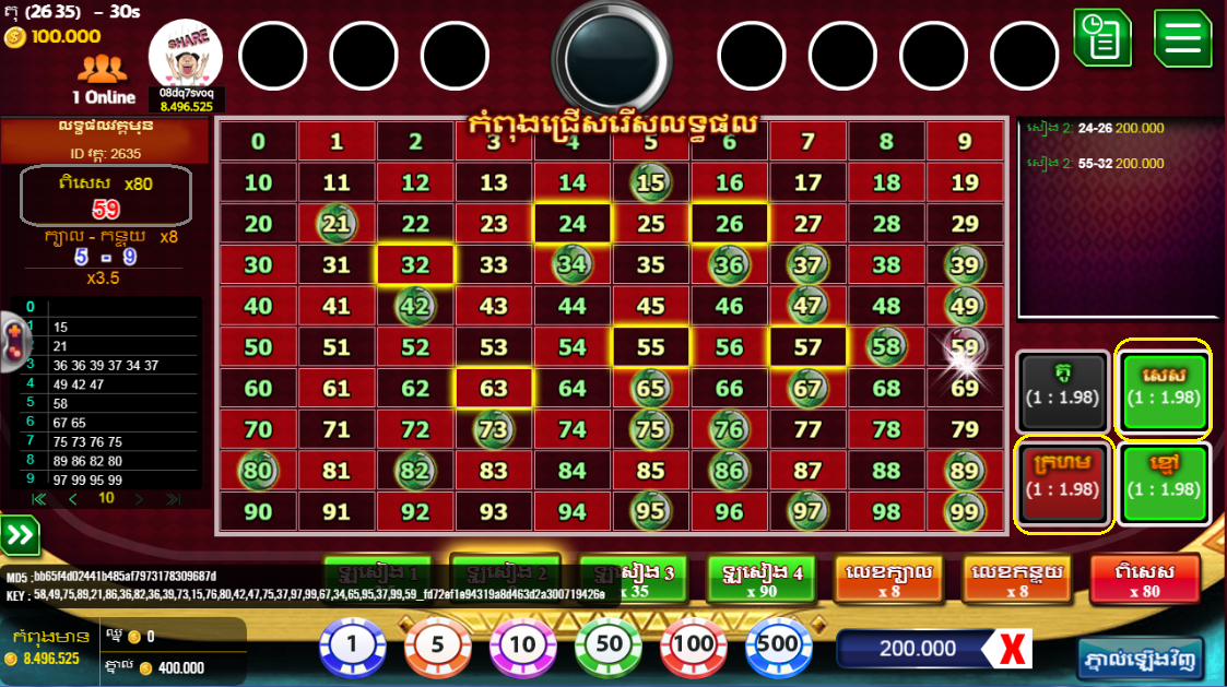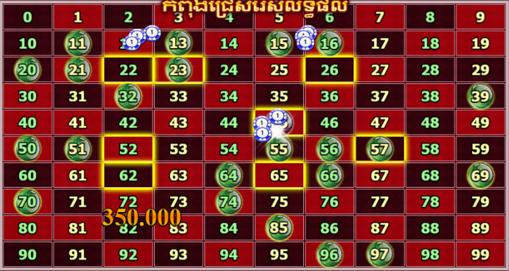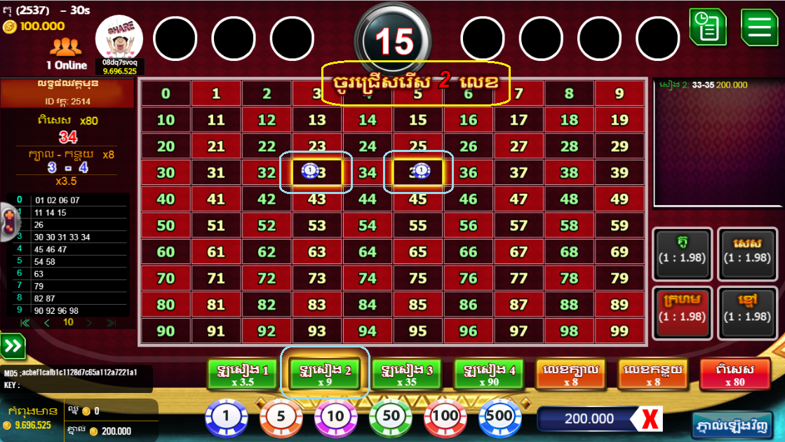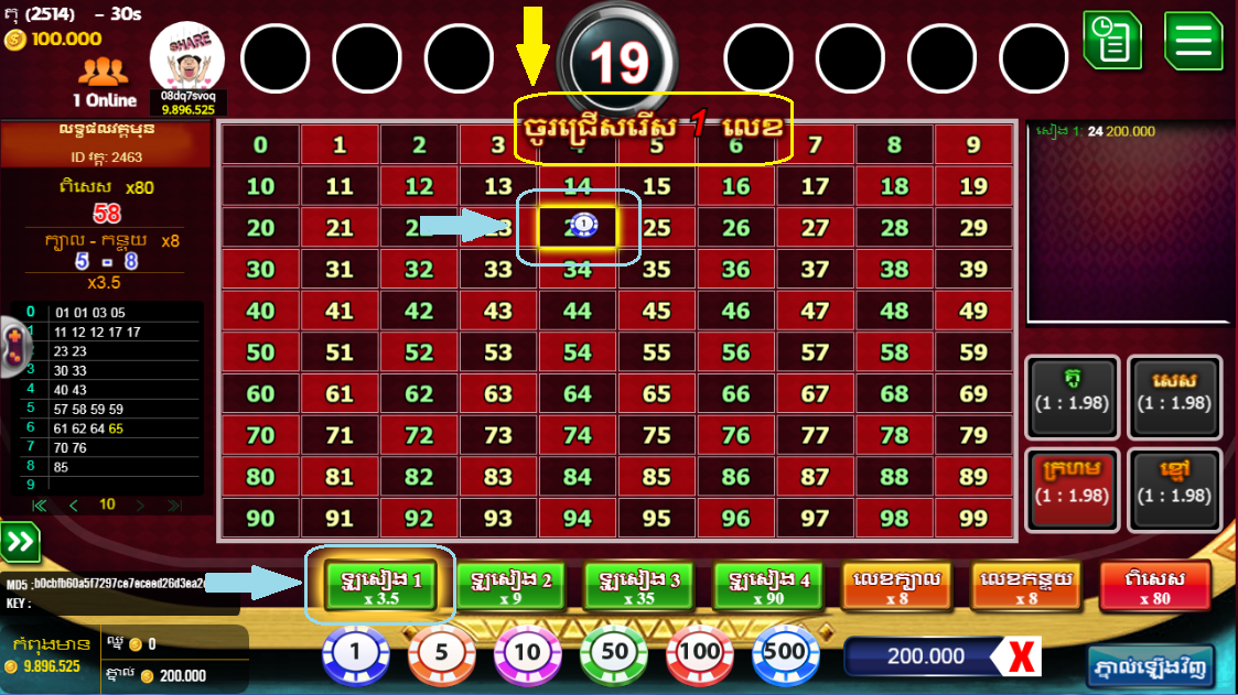 សៀន១៖ អ្នកលេងជ្រើសយកប៊ូតុងសៀន១( ដូចរូបខាងក្រោម) ប្រព័ន្ធនឹងប្រាប់អ្នកអោយជ្រើសរើសលេខណាមួយនៅក្នុងក្ដាលេខពីលេខ ០ ដល់លេខ ៩៩។ ពេលនោះអ្នកនឹងបានជ្រើសរើសលេខណាមួយតាមចិត្ត( ដូចរូបខាងក្រោម ការ៉ូដែលជ្រើសរើសគឺលេខ២៤)។ នៅពេលនោះនៅក្នុងប្រព័ន្ធនឹងមានប្រវត្តិបង្ហាញបច្ចុប្បន្នរបស់អ្នកលេង។