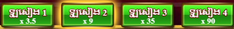 សរុបទាំងអស់មាន៦កម្រិត៖ 1, 5, 10, 50, 100, 500 សម្រាប់កម្រិតភ្នាល់និមួយៗអ្នកលេងនឹងចំណាយៈ កម្រិតx 1.000 កាក់